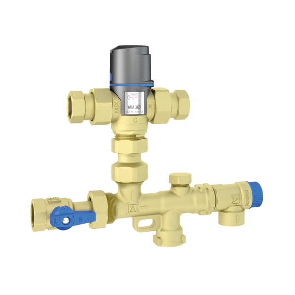 Images 1 Back ATM 363 WSG | 68419 thermostatic mixing valve in-stock items Documents Benefits compact assembly for tankless water heaters and solar-heated drinking water heatersthermally controlled hot water temperature (with scald protection)all relevant backflow preventers at the correct positionsextremely time-saving as compared to installation consisting of many individual parts Application Mixing valve with boiler safety group assembly for controlling hot water at solar-heated drinking water heaters and buffer tanks with hot water heating according to flow principle, as well as drinking water storage units. Ideal for applications in which circulation is not necessary or if the water heater already has a circulation connection. Description Compact, pre-assembled and tightness-tested assembly consisting of adjustable thermostatic mixing valve, safety group assembly with integrated backflow preventers, shut-off valve and safety valve. Mixing valve control knob with temperature scale (35/60 °C) for easy adjustment of the temperature of the water to be mixed. A cap protects the control knob against improper operation; it can be lead-sealed to help prevent unwanted adjustments. The selected adjustment is visible through the window in the cap. If the cold water line is interrupted, the mixing valve automatically closes the hot water supply to help protect against scalding. Technical data Downloads Technical data system connectionsG¾ femaleOperating temperature rangeMedium: max. 95 °CMixing temperature35/60 °CSystem pressuremax. 10 barFlow coefficient Kvs1.6 m³/hHousingBrassSafety valveopening pressure: 6 barDimensionsW x H x D: 260 x 221 x 60 mmScope of deliveryassembly without insulation Downloads thermische Mischventile ATM 363 WMG, ATM 363 WSG Manuals PDF Download