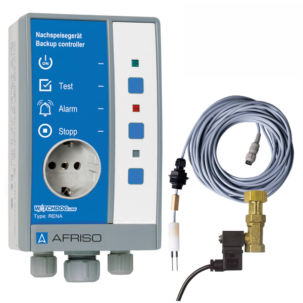 Products Our motto "Technology for Environmental Protection" has long been an inherent part of our product development philosophy and product range. We strive to improve the environment, to make processes which work with greater environmental compatibility and to avoid putting a strain on the environment. We offer you a multitude of innovative solutions, new products and smart concepts. More Informations Industries & Topics Industries & Topics Overview Fuel oil components Fuel oil components Overview Fast and clean oil filter change Avoiding fungal attacks in biofuel More performance with the sintered plastic sieve AFRISO Smart Home AFRISO Smart Home Overview Gateway HG 02 Products Products Overview AFRISOhome App Alexa Smart home applications Smart home applications Overview Leakage security Security Stand-alone applications Stand-alone applications Overview Getting started with AFRIShome Smart Home Craft 4.0 Craft 4.0 Overview OEM-Manifold systems Hydraulic Balancing Hydraulic Balancing Overview VarioQ Vario-DP Tank conversion Hygienic processes AFRISO Smart Home AFRISO Smart Home offers innovative solutions for intelligent home automation. With modern sensors and actuators, you can easily and conveniently control your home. More Informations Service-Center Service-Center Overview Service Contact persons Data exchange formats Catalogs Service-Center Flexible, cost-aware, on schedule, solution-oriented and fast – the AFRISO team always provides the decisive added value. More Informations Training & Events Training & Events Overview Exhibitions Exhibitions Overview SHK+E 2026, Essen IFH Intherm 2026, Nuremberg GET Nord 2026, Hamburg Search Domestic technology Water technology 53100 Nachspeiseset RENA level probe Solenoid valve Images 2 Back RENA | 53100 Nachspeiseset für Regenwasserspeicher in-stock items Documents Benefits microprocessor-controlled mains water backup to rainwater tanks with connected domestic water stationDry run protection and safety shutdown2 program times for normal or increased water consumptioneasy handling - fast installation Application For monitoring rainwater tanks for sufficient water level. The backup controller RENA, consisting of control unit RENA, probe and solenoid valve, is designed for fully automatic supply of drinking water to rainwater tanks with connected water station. Continuous operation without frequent on and off cycles, two selectable program times for normal or increased water consumption, with leak monitoring, dry run protection and protection against deposits. Description The complete backup controller kit consists of a control unit, indicators and controls and a socket with PE contact for connection of the water station, a probe for the water tank and a solenoid valve for connection to the water tap. If, as a result of insufficient precipitation or considerable water withdrawal, the level in the tank falls below a specific value, the solenoid valve is opened and fresh water from the drinking water mains system is supplied. 2 program times are selectable, depending on the water consumption (e.g. garden watering, car wash). In order to avoid the formation of deposits at the solenoid valve, the valve is opened and closed for one second three times in a row once per week. RENA features a safety shut-off system that responds to leaks in the tank or the pipes. Technical data Downloads Accessories Technical data functionsFully automatic backup controller for supplying drinking water to rainwater tanks with connected water station, with leak monitoring, dry run protection and protection against deposits.Operating temperature rangeAmbient: 0/40 °CStorage: -10/+60 °Cisolated, earthed power outletAC 230 Vfuse: T 10 ASupply voltageAC 230 VNominal powermax. 5 VAHousingWall mounting housing made of impact-resistant plastic (ABS)W x H x D: 100 x 188 x 65 mmWeight: 0.5 kgDegree of protection: IP 20 (EN 60529)Solenoid valvefor drinking water and rainwaterW x H x D: 95 x 80 x 100 mmConnection: G½ x G¾Flow rate: max. 50 l/minmax. inlet pressure 4 bar, open outletSupply voltage: AC 230 Vmains cable: 3 mDegree of protection: IP 65 (EN 60529)level probefor drinking water and rainwaterL x ⌀: 87 x 30 mmSupply voltage: AC 6 VScope of deliveryControl unit RENAFüllstandsonde RENA mit 15 m Sondenkabelsolenoid valve (G½ x G¾) with 3 m mains cableBetriebsanleitung Downloads Nachspeisegerät für Regenwasserspeicher RENA Manuals PDF Download Accessories Mounting accessories Abb. Bezeichnung Dichtungsrahmen IP 54 | 43416 mounting frame | 43521 Montageset WATCHDOG Warngeräte | 43100 Related products