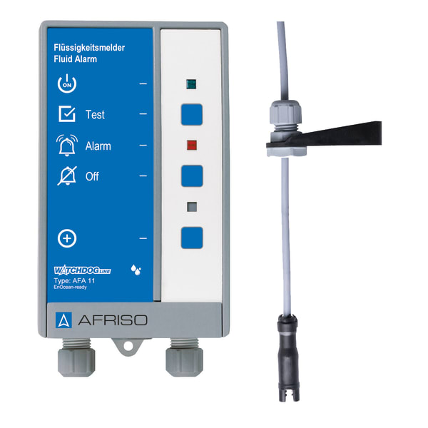 Products Our motto "Technology for Environmental Protection" has long been an inherent part of our product development philosophy and product range. We strive to improve the environment, to make processes which work with greater environmental compatibility and to avoid putting a strain on the environment. We offer you a multitude of innovative solutions, new products and smart concepts. More Informations Industries & Topics Industries & Topics Overview Fuel oil components Fuel oil components Overview Fast and clean oil filter change Avoiding fungal attacks in biofuel More performance with the sintered plastic sieve AFRISO Smart Home AFRISO Smart Home Overview Gateway HG 02 Products Products Overview AFRISOhome App Alexa Smart home applications Smart home applications Overview Leakage security Security Stand-alone applications Stand-alone applications Overview Getting started with AFRIShome Smart Home Craft 4.0 Craft 4.0 Overview OEM-Manifold systems Hydraulic Balancing Hydraulic Balancing Overview VarioQ Vario-DP Tank conversion Hygienic processes AFRISO Smart Home AFRISO Smart Home offers innovative solutions for intelligent home automation. With modern sensors and actuators, you can easily and conveniently control your home. More Informations Service-Center Service-Center Overview Service Contact persons Data exchange formats Catalogs Service-Center Flexible, cost-aware, on schedule, solution-oriented and fast – the AFRISO team always provides the decisive added value. More Informations Training & Events Training & Events Overview Exhibitions Exhibitions Overview SHK+E 2026, Essen IFH Intherm 2026, Nuremberg GET Nord 2026, Hamburg Search Industrial technology Alarm units, gas alarm systems and gas analysers AFA 11 Images 3 AFA 11 liquid detector Variants Documents Benefits For storage rooms, manholes, collection facilities, etc.with visual and audible alarmsTest/Acknowledge keys and relay outputSelf-monitoring probePower outage alarm with optional batteryEnOceanⓇ-ready: Can be smart-home-enabled for AFRISOhome (can be retrofitted) Application For visual and audible alarms if liquids with a flash point of > 55 °C are detected. AFA 11 is suitable for fuel oil, diesel fuel, synthetic fuels (for example, GTL) as per EN 15940 and urea solution 32.5 % as per DIN 70070 (AdBlue). Also suitable for motor oils, gearbox oils, machine oils, hydraulic oils or lubricating oils as well as transformer oils, vegetable oils (for example, HVO), water and other liquids. Application as leak detection system class III as per EN 13160-1/-4 as well as safety device as per worksheet DWA-A 791 and worksheet DWA-A779. Description The liquid detector AFA 11 is the successor product of the oil/water alarm unit 3.The unit in a wall mounting housing triggers visual and audible alarms in the event of accumulations of liquids which can be caused by leaks, backflow, flooding, etc. AFA 11 consists of a control unit with visual/audible alarm, Test and Acknowledge keys, a relay output and a photoelectric probe. The probe is mounted at the lowest point of the area to be monitored. Alarm is triggered when escaped liquid is detected. The audible alarm can be muted with the Acknowledge key. The visual alarm remains active until the leak has been removed. The Test key allows you to simulate an alarm condition in order to perform a function test. The voltage-free relay contact is provided for connection of additional alarm equipment (such as additional alarm unit ZAG 01, horn) or building control technology. The alarm units are suitable for panel mounting with a mounting frame.Power outage alarm: An optional 9 V battery can be connected so that an audible alarm is triggered in the case of power outage. The alarm cannot be acknowledged and is disabled once power is available again.EnOcean® ready: AFA 11 can be integrated into the AFRISO smart home system or other smart home systems based on EnOcean® wireless by means of the optional wireless module TCM 320. This allows for additional push messages to smartphones or via e-mail (further accessories required). Variants Technical data Downloads Accessories Spare parts Variants Part no.liquid detector AFA 11AC 230 V40890liquid detector AFA 11AC/DC 24 V40894 in-stock items manufactured goods Technical data Operating temperature rangeAmbient: -10/+60 °CProbeL x ⌀: 33 x 10 mmCable length: 10 mResponse level (EN 13160-4): ≥ 4 mmSupply voltageAC 100 − 240 VNominal powerAC 230 V: 1.5 VASwitching outputRelay contact: 1 x voltage-free changeover contactContact rating: max. AC 250 V, 2 AContact rating: max. DC 30 V, 2 AAlarm soundmin. 70 dB(A)HousingWall mounting housing made of impact-resistant plastic (ABS)W x H x D: 100 x 188 x 65 mmWeight: 500 gDegree of protection: IP 30 (EN 60529)approvalDIBt: Z-65.40-214Scope of deliveryControl unitoptoelektronische SondeOptionEnOcean® wireless module (can be retrofitted) Downloads WATCHDOG-LINE Warngeräte PDF English German Leckageerkennungssystem Certificates / DIBt approvals PDF Download Flüssigkeitsmelder AFA 11 Flüssigkeitsmelder mit BAS AFA11 PDF Download Flüssigkeitsmelder AFA 11 Manuals PDF Download Accessories Mounting accessories Abb. Bezeichnung Drip pan | 44512 Dichtungsrahmen IP 54 | 43416 mounting frame | 43521 Montageset WATCHDOG Warngeräte | 43100 Function extensions Abb. Bezeichnung TCM 320 | 78082 Spare parts Probes and sensors Abb. Bezeichnung Optoelektronische Sonde für OM/WM | 44503 Related products