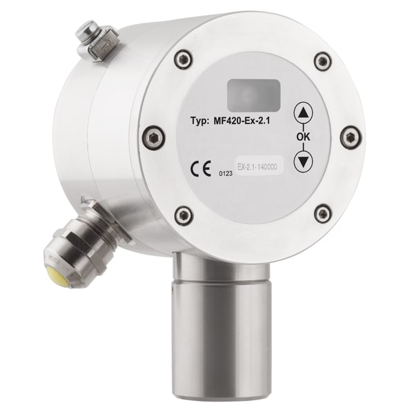 Images 2 MF420-Ex-2.1 Gasmesssystem mit EX-Zulassung für Zone 1 und 2 Variants Benefits for monitoring of combustible gases and vapours or carbon monoxideon site calibration by one person (without opening the housing), indication of measured value and system infomeasuring principle: Heat tone principle (WT) or electro-chemical principle (EC)suitable for control units GW-S 2.1, GW-S4.1 and GW-SK 6.1 Application For the detection and monitoring of flammable, explosive, toxic gases or oxygen. Can also be used in dusty and dirty environments. Can be used as standalone measuring system or in conjunction with the gas alarm systems GW-S 2.1, GW-S4.1 und GW-SK 6.1 as a complete gas alarm facility for hazardous areas. Approved for operation in potentially explosive atmospheres/EX areas zone 1 and zone 2. Description Gas sensor with digital display in compact wall mounting housing. Diverse gases can be monitored (see ordering table). Connection cable (shielded) 3 x 1.5 mm2 Cu+ protective conductor, supply and return conductor (max. 100 Ohm line resistance). Thanks to the local display, it is possible to immediately read current measured values, perform calibration and set limit values. The concentration is output via the 4–20 mA interface for further processing. Variants Technical data Variants Part no.Gas measuring system MF420-Ex-2.1 (P) methane69111Gas measuring system MF420-Ex-2.1 (WT) propane69004Gas measuring system MF420-Ex-2.1 (WT) n butane69007Gas measuring system MF420-Ex-2.1 (WT) LPGfor monitoring of liquefied petroleum gas69009Gas measuring system MF420-Ex-2.1 (WT) H2for monitoring hydrogen69010Gas measuring system MF420-Ex-2.1 (WT) n heptane69013Gas measuring system MF420-Ex-2.1 (WT) xylene69014Gas measuring system MF420-Ex-2.1 (WT) ethanol69034Gas measuring system MF420-Ex-2.1 (WT) i propanol69035Gas measuring system MF420-Ex-2.1 (WT) acetylene69036Gas measuring system MF420-Ex-2.1 (EC) COfor monitoring carbon monoxide69037 in-stock items manufactured goods Technical data Measuring rangeversion WT: 0/100 % UEGMeasuring principleheat tone (HT)Service life: ca. 3 JahreSupply voltageDC 18 − 30 VCurrent inputca. 105 mA ca. at 24 VOperating temperature rangeAmbienttemperature class T4: -40/+60 °Ctemperature class T6: -40/+50 °CHumidity/moisture10/95 % r.F., Non-condensingAtmospheric pressure700/1 300 hPaHousingWall mounting housingmaterial: aluminium alloy/stainless steel⌀ x H: 84 x 78 mmWeight: 1.1 kgDegree of protection: IP 65 (EN 60529)Output signal4–20 mAEx approvalEx II 2G Ex de IIC T6/T4 Gb