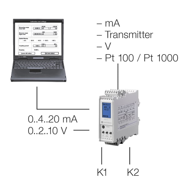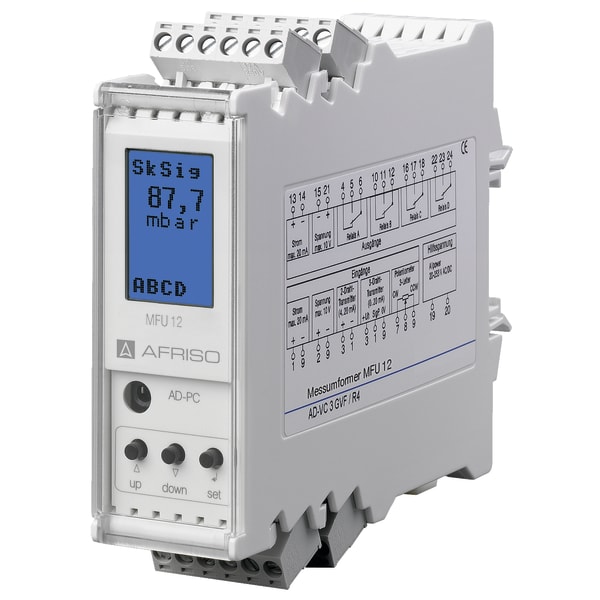 Products Our motto "Technology for Environmental Protection" has long been an inherent part of our product development philosophy and product range. We strive to improve the environment, to make processes which work with greater environmental compatibility and to avoid putting a strain on the environment. We offer you a multitude of innovative solutions, new products and smart concepts. More Informations Industries & Topics Industries & Topics Overview Fuel oil components Fuel oil components Overview Fast and clean oil filter change Avoiding fungal attacks in biofuel More performance with the sintered plastic sieve AFRISO Smart Home AFRISO Smart Home Overview Gateway HG 02 Products Products Overview AFRISOhome App Alexa Smart home applications Smart home applications Overview Leakage security Security Stand-alone applications Stand-alone applications Overview Getting started with AFRIShome Smart Home Craft 4.0 Craft 4.0 Overview OEM-Manifold systems Hydraulic Balancing Hydraulic Balancing Overview VarioQ Vario-DP Tank conversion Hygienic processes AFRISO Smart Home AFRISO Smart Home offers innovative solutions for intelligent home automation. With modern sensors and actuators, you can easily and conveniently control your home. More Informations Service-Center Service-Center Overview Service Contact persons Data exchange formats Catalogs Service-Center Flexible, cost-aware, on schedule, solution-oriented and fast – the AFRISO team always provides the decisive added value. More Informations Training & Events Training & Events Overview Exhibitions Exhibitions Overview SHK+E 2026, Essen IFH Intherm 2026, Nuremberg GET Nord 2026, Hamburg Search Industrial technology Display units, signal processing Messumformer MFU 12/14 Images 2 Messumformer MFU 12/14 multifunctional transducer Variants Benefits Universal input (current, voltage, resistance)integrated supply voltage for 2/3-wire transmitter2 analogue outputs2 or 4 additional contact outputsProgramming interfaceUniversal power supply unit Application The digital multi-purpose transducers are freely programmable digital transducers with two analogue outputs and up to 4 relays. Description Current up to 20 mA (also bipolar), voltage up to 10 V (also bipolar) or a three-wire technology potentiometer are possible input signals. In addition, a supply for 2-wire or 3-wire transmitters is integrated. The inputs are galvanically isolated from the voltage and the outputs. The two analogue outputs can be used simultaneously. Variants Technical data Variants Part no.Transducer MFU 122 voltage-free changeover contacts53722Transducer MFU 144 voltage-free changeover contacts53723 in-stock items manufactured goods Technical data Displaymulti-line LCD,42 x 64 Pixel,multicolour backlight,Hintergrundbeleuchtung abschaltbarRange0 to 9,999 digits,start and end values configurable as required,freie Skaliereinheit,3 languages (German, English, French)Accuracy± 0.2 % of maximum valueResolutioninputs: 13 Bitoutputs: 10 BitinputsCurrent: max. -20.4/+20.4 mA, adjustable as requiredvoltage: max. -10.2/+10.2 V, adjustable as requiredpotentiometer: 0.1/100 kOhm, adjustable as requiredtransmitter supply: DC 19.5 − 24.5 VAnalogue output 1 (current)max. 0/4–20.4 mA, adjustable as requiredgalvanically isolated from inputAnalogue output 2 (voltage)max. 0/2–10.2 V, adjustable as requiredgalvanically isolated from inputswitching outputsMFU 12: 2 voltage-free changeover contactsConfigurable as requiredContact rating: max. AC 250 Vconfigurable functions: energising/de-energising, hysteresis, window or trend function wählbare Anzugs- und AbfallverzögerungenLinearisationvia 24 free x/y points on characteristic curve Kennlinienmodus Tabelle, Zylinder, Kugeladditional functionsAlarm message in the case of missing or defective sensor Lupenfunktion, Spreizung, Inversmodus, Trendanzeige, Lernfunktionen automatic or manual simulation mode Verriegelung der Parametrierung über Editiersperre Programming interfaceSupply voltageAC 50 − 253 VDC 20 − 253 VHousingDIN rail housingW x H x D: 33 x 110 x 128 mmscrew terminals removable Related products