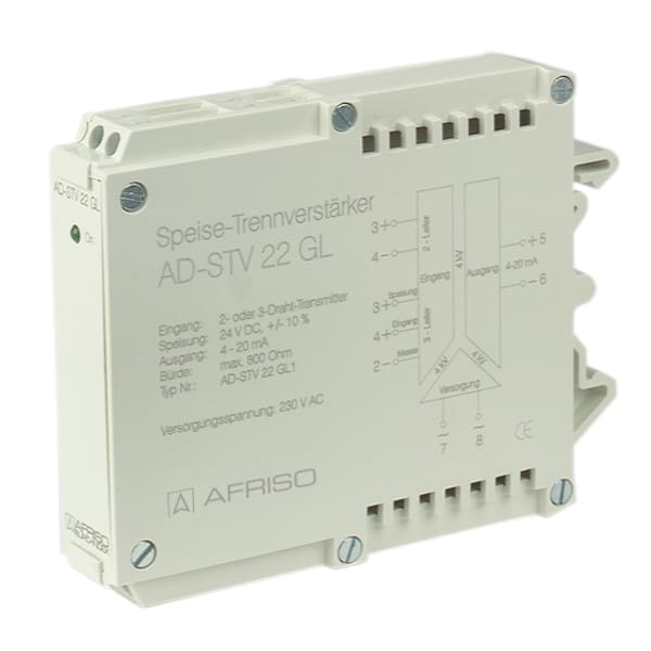 Products Our motto "Technology for Environmental Protection" has long been an inherent part of our product development philosophy and product range. We strive to improve the environment, to make processes which work with greater environmental compatibility and to avoid putting a strain on the environment. We offer you a multitude of innovative solutions, new products and smart concepts. More Informations Industries & Topics Industries & Topics Overview Fuel oil components Fuel oil components Overview Fast and clean oil filter change Avoiding fungal attacks in biofuel More performance with the sintered plastic sieve AFRISO Smart Home AFRISO Smart Home Overview Gateway HG 02 Products Products Overview AFRISOhome App Alexa Smart home applications Smart home applications Overview Leakage security Security Stand-alone applications Stand-alone applications Overview Getting started with AFRIShome Smart Home Craft 4.0 Craft 4.0 Overview OEM-Manifold systems Hydraulic Balancing Hydraulic Balancing Overview VarioQ Vario-DP Tank conversion Hygienic processes AFRISO Smart Home AFRISO Smart Home offers innovative solutions for intelligent home automation. With modern sensors and actuators, you can easily and conveniently control your home. More Informations Service-Center Service-Center Overview Service Contact persons Data exchange formats Catalogs Service-Center Flexible, cost-aware, on schedule, solution-oriented and fast – the AFRISO team always provides the decisive added value. More Informations Training & Events Training & Events Overview Exhibitions Exhibitions Overview SHK+E 2026, Essen IFH Intherm 2026, Nuremberg GET Nord 2026, Hamburg Schulungen & Trainings Schulungen & Trainings Overview Heizen mit flüssigen Brennstoffen Inhouse-Schulung - Heizen mit flüssigen Brennstoffen Inhouse-Schulung Heizölverbraucheranlagen Smart Home Experte Search Industrial technology Display units, signal processing 53706 Speisetrennverstärker STV 22 GL Images 1 Back STV 22 GL | 53706 Supply isolation amplifier manufactured goods Application The STV 22 GL isolating amplifier with supply is used for the galvanic isolation and amplification of DC signals (mA). Description The connected transducer is directly supplied by means of a galvanically isolated and limited supply voltage. Input and output are galvanically isolated with a high degree of isolation. The integrated high-efficiency electronic power supply unit helps to avoid overheating and allows for high output loads. Technical data Technical data HousingDIN rail housingW x H x D: 18 x 78 x 103 mmSupply voltageAC 50 − 253 VDC 20 − 253 VSensor supplyDC 24 V open circuit voltageDC 18 V bei 20 mAInput0–20 mA oder 4–20 mAOutput0–20 mA oder 4–20 mA1:1 to input signalOutput loadmax. 400 Ohm Related products