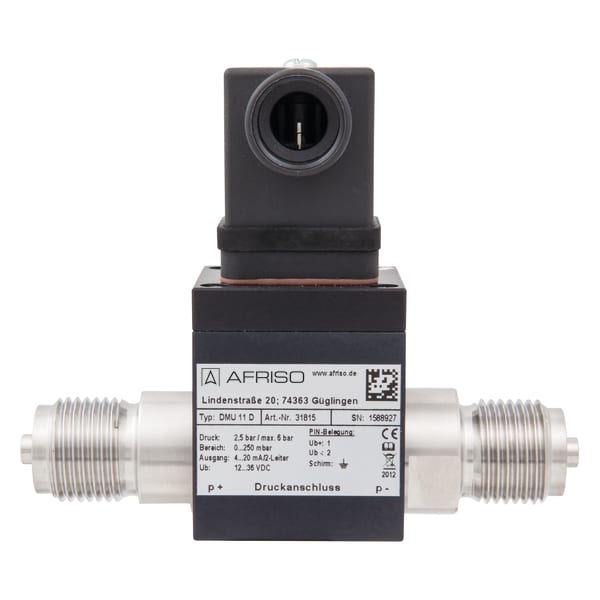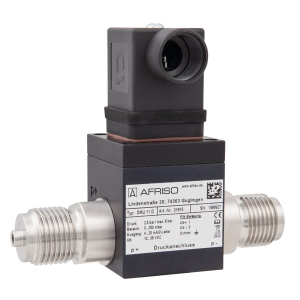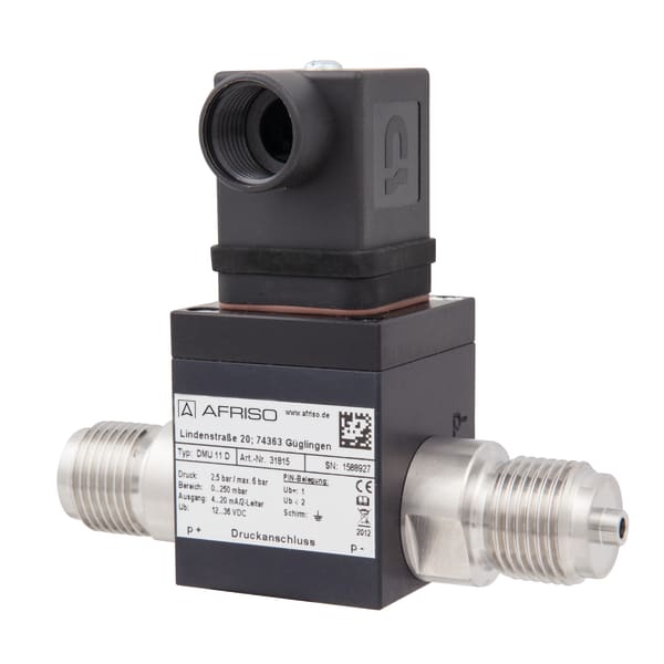 Products Our motto "Technology for Environmental Protection" has long been an inherent part of our product development philosophy and product range. We strive to improve the environment, to make processes which work with greater environmental compatibility and to avoid putting a strain on the environment. We offer you a multitude of innovative solutions, new products and smart concepts. More Informations Industries & Topics Industries & Topics Overview Fuel oil components Fuel oil components Overview Fast and clean oil filter change Avoiding fungal attacks in biofuel More performance with the sintered plastic sieve AFRISO Smart Home AFRISO Smart Home Overview Gateway HG 02 Products Products Overview AFRISOhome App Alexa Smart home applications Smart home applications Overview Leakage security Security Stand-alone applications Stand-alone applications Overview Getting started with AFRIShome Smart Home Craft 4.0 Craft 4.0 Overview OEM-Manifold systems Hydraulic Balancing Hydraulic Balancing Overview VarioQ Vario-DP Tank conversion Hygienic processes AFRISO Smart Home AFRISO Smart Home offers innovative solutions for intelligent home automation. With modern sensors and actuators, you can easily and conveniently control your home. More Informations Service-Center Service-Center Overview Service Contact persons Data exchange formats Catalogs Service-Center Flexible, cost-aware, on schedule, solution-oriented and fast – the AFRISO team always provides the decisive added value. More Informations Training & Events Training & Events Overview Exhibitions Exhibitions Overview SHK+E 2026, Essen IFH Intherm 2026, Nuremberg GET Nord 2026, Hamburg Search Industrial technology Electronic pressure measuring instruments DeltaFox DMU 11 D Images 5 DeltaFox DMU 11 D Druckmessumformer Differenzdruckausführung Variants Documents Info Connection2 x G½BConnectionEN 837-1/7.3Electrical connectionConnector and junction box as per ISO 4400 (DIN 43650-A) Benefits compact designhigh overload safetymechanically robust and reliable, suitable for applications involving dynamic pressure changes as well as shock and vibration Application For electronic differential pressure measurement in industrial applications. For corrosive gaseous and liquid media which are not highly viscous and do not crystallise. Variants Technical data Downloads Variants RangeMeasuring rangeTypeVersionPart no.0/40 mbarDeltaFox DMU 11 D318300/60 mbarDeltaFox DMU 11 D318310/100 mbarDeltaFox DMU 11 D318130/160 mbarDeltaFox DMU 11 D318140/250 mbarDeltaFox DMU 11 D318150/400 mbarDeltaFox DMU 11 D318320/600 mbarDeltaFox DMU 11 D318330/1 barDeltaFox DMU 11 D318160/1.6 barDeltaFox DMU 11 D318340/2.5 barDeltaFox DMU 11 D318170/4 barDeltaFox DMU 11 D318350/6 barDeltaFox DMU 11 D318180/10 barDeltaFox DMU 11 D318360/16 barDeltaFox DMU 11 D31837 in-stock items manufactured goods Technical data Measuring rangesee ordering tableOperating temperature rangeMedium: -25/+125 °CAmbient: -25/+85 °CStorage: -40/+100 °Cdynamic characteristicsResponse time: < 5 msProcess connection2 x G½B EN 837-1/7.3materialHousing: aluminium, eloxed, blackpressure connection: Stainless steel 316 Ldiaphragm: Stainless steel 316 LSeal: FKM (Viton)Supply voltageDC 12 − 36 VOutput signal2-wire, 4–20 mALoadRmax = [(UB – UBmin)/0.02 A] ΩCurrent input< 25 mAelectrical protectionshort circuit proof and protected against reverse polarityElectrical connectionConnector and junction box as per ISO 4400 (DIN 43650-A)Degree of protectionIP 65 (EN 60529)CE conformityEMC Directive 2014/30/EURoHS-Richtlinie 2011/65/EUPressure Equipment Directive 2014/68/EUScope of deliverypressure measuring instrumentBefestigungswinkel Downloads Differenzdruckmessumformer DMU 10 D, DMU 11 D PDF Download Druckmessumformer DMU 07/DMU 07 FG/DMU 08/DMU 08 T/DMU 09/ DMU 10 D/ DMU 11 D Domestic Technology PDF English German Differenzdruckmessumformer DMU 10 D, DMU 11 D Manuals PDF English German elektronische Druckmesstechnik - Druckmessumformer Serie DMU PDF Italian English German Related products