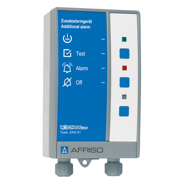 Products Our motto "Technology for Environmental Protection" has long been an inherent part of our product development philosophy and product range. We strive to improve the environment, to make processes which work with greater environmental compatibility and to avoid putting a strain on the environment. We offer you a multitude of innovative solutions, new products and smart concepts. More Informations Industries & Topics Industries & Topics Overview Fuel oil components Fuel oil components Overview Fast and clean oil filter change Avoiding fungal attacks in biofuel More performance with the sintered plastic sieve AFRISO Smart Home AFRISO Smart Home Overview Gateway HG 02 Products Products Overview AFRISOhome App Alexa Smart home applications Smart home applications Overview Leakage security Security Stand-alone applications Stand-alone applications Overview Getting started with AFRIShome Smart Home Craft 4.0 Craft 4.0 Overview OEM-Manifold systems Hydraulic Balancing Hydraulic Balancing Overview VarioQ Vario-DP Tank conversion Hygienic processes AFRISO Smart Home AFRISO Smart Home offers innovative solutions for intelligent home automation. With modern sensors and actuators, you can easily and conveniently control your home. More Informations Service-Center Service-Center Overview Service Contact persons Data exchange formats Catalogs Service-Center Flexible, cost-aware, on schedule, solution-oriented and fast – the AFRISO team always provides the decisive added value. More Informations Training & Events Training & Events Overview Exhibitions Exhibitions Overview SHK+E 2026, Essen IFH Intherm 2026, Nuremberg GET Nord 2026, Hamburg Schulungen & Trainings Schulungen & Trainings Overview Heizen mit flüssigen Brennstoffen Inhouse-Schulung - Heizen mit flüssigen Brennstoffen Inhouse-Schulung Heizölverbraucheranlagen Smart Home Experte Search ... Accessories and spare parts for level indicators and level controllers 40633 Zusatzalarmgerät ZAG 01 Images 3 Back ZAG 01 | 40633 Additional alarm unit manufactured goods Documents Benefits audible and visual alarms for maximum safetymanufacturer-independent use with devices with switching output (relay contact)with 2 voltage-free changeover contacts (at output side)ready-to-connect device for easy installation and commissioning Application For indication and transfer of alarm signals from AFRISO WATCHDOG alarm units, AFRISO leak detectors or any other switching equipment. Suitable for triggering additional visual and audible alarms in buildings, e.g. in the case of underground tank facilities or in rooms which are far away from the dangerous location. Can be connected directly to the output of the alarm unit. Description The additional alarm unit in a wall mounting housing signals alarm conditions in conjunction with an alarm unit or a leak detector. ZAG 01 is connected to the voltage-free contact of the alarm unit. A 230 V alarm input is also available. The audible alarm can be acknowledged with the Acknowledge button in the case of an alarm. The visual alarm is cleared once the leak or event has been removed. The Test button allows you to perform a function test.The voltage-free relay contacts allow for connection of additional external signalling equipment (such as horns), event reporting systems EMS, building control systems or similar equipment. ZAG 01 is suitable for panel mounting with a mounting frame. A sealing kit (IP 54) is available for rough application conditions. Technical data Downloads Accessories Technical data Operating temperature rangeAmbient: -10/+60 °CStorage: -10/+60 °CSupply voltageAC 230 VNominal power 3 VAAlarm inputinput 1: voltage-freeinput 2: AC 230 Vswitching outputsrelay contacts: 1 voltage-free changeover contact, can be acknowledged1 potenzialfreier Wechsler, nicht quittierbarContact rating: AC 250 V, 2 AAlarm soundmin. 70 dB(A)HousingWall mounting housing made of impact-resistant plastic (ABS)W x H x D: 100 x 188 x 65 mmWeight: 0.4 kgDegree of protection: IP 40 (EN 60529) Downloads Zusatzalarmgerät ZAG 01 Manuals PDF Download Accessories Mounting accessories Abb. Bezeichnung Dichtungsrahmen IP 54 | 43416 mounting frame | 43521 Montageset WATCHDOG Warngeräte | 43100 Related products CoFox® ELT 680 conductivity level switch CoFox® ELT 8 conductivity level switch