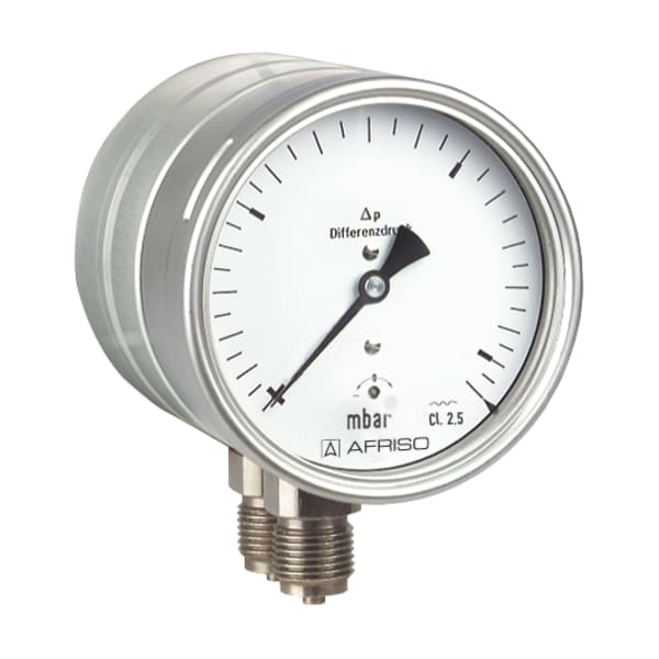 Products Our motto "Technology for Environmental Protection" has long been an inherent part of our product development philosophy and product range. We strive to improve the environment, to make processes which work with greater environmental compatibility and to avoid putting a strain on the environment. We offer you a multitude of innovative solutions, new products and smart concepts. More Informations Industries & Topics Industries & Topics Overview Fuel oil components Fuel oil components Overview Fast and clean oil filter change Avoiding fungal attacks in biofuel More performance with the sintered plastic sieve AFRISO Smart Home AFRISO Smart Home Overview Gateway HG 02 Products Products Overview AFRISOhome App Alexa Smart home applications Smart home applications Overview Leakage security Security Stand-alone applications Stand-alone applications Overview Getting started with AFRIShome Smart Home Craft 4.0 Craft 4.0 Overview OEM-Manifold systems Hydraulic Balancing Hydraulic Balancing Overview Vario-DP Tank conversion Hygienic processes AFRISO Smart Home AFRISO Smart Home offers innovative solutions for intelligent home automation. With modern sensors and actuators, you can easily and conveniently control your home. More Informations Service-Center Service-Center Overview Service Contact persons Data exchange formats Catalogs Service-Center Flexible, cost-aware, on schedule, solution-oriented and fast – the AFRISO team always provides the decisive added value. More Informations Training & Events Training & Events Overview Exhibitions Exhibitions Overview SHK+E 2026, Essen IFH Intherm 2026, Nuremberg GET Nord 2026, Hamburg Search Industrial technology Mechanical pressure measuring instruments MF100Dif D401 Images 3 MF100Dif D401 Membran-Feder-Standardmanometer für Differenzdruck - überlastbar Variants Documents Benefits direct indication of the differential pressurehigh overload protectionZero correctionwith integrated pressure damping Application For differential pressure measurement at low differential pressure and high static pressure. For non-corrosive gaseous and liquid media which are not highly viscous. Particularly suitable for monitoring filters, pumps and pipe systems. Variants Technical data Technical drawings Downloads Variants Typehousing ⌀Housingaccuracy classConnectionAusrichtungRangeTypeTypePart no.MF100Dif D401100 mmStainless steel 3042,52 x G½B0/250 mbarMF100DifD40188086401MF100Dif D401100 mmStainless steel 3042,52 x G½B0/400 mbarMF100DifD40188087401MF100Dif D401100 mmStainless steel 3042,52 x G½B0/600 mbarMF100DifD40188088401 in-stock items manufactured goods Technical data TypeMF100Dif D401Nominal size100 - 100FunctionThe pressures act on two pressure chambers separated by an elastic diaphragm. If there are different pressures in the chambers, the diaphragm is axially displaced against a compression spring. This is transmitted to the movement by means of a rod. The differential pressure is directly indicated by a pointer. The diaphragm is held by a metallic support which results in an overpressure safety of up to 25 bar at both sides.accuracy class (EN 837-3/6)2,5rangessee ordering tablemaximum static pressure25 barOverpressure safetyup to the maximum static pressure at both endsOperating temperature rangeMedium: max. 60 °CAmbient: -20/+60 °CTemperature performanceIndication error when the temperature of the measuring system deviates from the normal temperature of 20 °C:bei Temperaturzunahme ca. ± 0,5 %/10 K,falling temperature approx. ± 0.5 %/10 Kvom jeweiligen SkalenendwertDegree of protectionIP 54 (EN 60529) Standard design ConnectionBrass nickel-platedbottom, parallel, one behind the otherMeasuring elementCompression spring, Stainless steel 301diaphragmFKM (Viton)Measuring flangeAluminium, eloxiertmovementBrassDialAluminium, weißScaling blackPointerAluminium, schwarzHousingEdelstahl 304bayonet bezelEdelstahl 304windowSicherheitsverbundglas Technical drawings Click the corresponding image for detail views, additional information and dimension tables. Bottom connection Dimensions (mm)NGab∅cc1c2GhkSW10016112,56320G½B843222 Downloads AFRISO_EU-KONFORMITAETSERKLAERUNG_DRUCKGERAETE_DE.PDF Industrial technology PDF Download Montage Manometer Manuals Industrial technology PDF Download Rohrfeder-, Kapselfeder-, Plattenfeder-, Membranfedermanometer für Differenzdruck Manuals Industrial technology PDF Ukrainian German German Related products