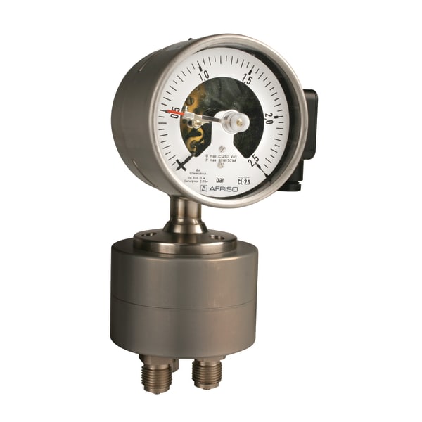 Images 3 MFW100ChDif D402 Membran-Feder-Standardmanometer für Differenzdruck - überlastbar Variants Documents Benefits direct indication of the differential pressurehigh overload protectioncompact designhigh resistance to chemicalsElectrical contacts optional Application For differential pressure measurement at low differential pressure and high static pressure. For corrosive gaseous and liquid media which are not highly viscous, also for use in corrosive environments. Particularly suitable for monitoring filters, pumps and pipe systems. Variants Technical data Technical drawings Downloads Variants Typehousing ⌀Housingaccuracy classConnectionAusrichtungRangeTypeTypePart no.MFW100ChDif D402100 mmStainless steel 3042,52 x G½B0/250 mbarMFW100ChDifD40288106402MFW100ChDif D402100 mmStainless steel 3042,52 x G½B0/400 mbarMFW100ChDifD40288107402MFW100ChDif D402100 mmStainless steel 3042,52 x G½B0/600 mbarMFW100ChDifD40288108402 in-stock items manufactured goods Technical data TypeMFW ChDif D402Nominal size100 - 100FunctionThe pressures act on two pressure chambers separated by an elastic diaphragm. If there are different pressures in the chambers, the diaphragm is axially displaced against a compression spring. This is transmitted to the movement by means of a rod. The differential pressure is directly indicated by a pointer. The diaphragm is held by a metallic support which results in an overpressure safety of up to 25 bar at both sides.accuracy class (EN 837-3/6)2,5ranges (EN 837-3/5)see ordering tablemaximum static pressure25 barOverpressure safetyup to the maximum static pressure at both endsOperating temperature rangeMedium: max. 60 °CAmbient: -20/+60 °CTemperature performanceIndication error when the temperature of the measuring system deviates from the normal temperature of 20 °C:bei Temperaturzunahme ca. ± 0,5 %/10 K,falling temperature approx. ± 0.5 %/10 Kvom jeweiligen SkalenendwertDegree of protectionIP 54 (EN 60529) Standard design Connectionstainless steel 316 Ti/316 LMFW ChDif: bottom, parallel next to each otherMeasuring elementCompression spring, Stainless steel 301diaphragmFKM (Viton)Measuring flangeEdelstahl 316 Ti/316 LmovementStainless steelDialAluminium, weißScaling blackPointerAluminium, schwarzHousingEdelstahl 304bayonet bezelEdelstahl 304windowSicherheitsverbundglas Technical drawings Click the corresponding image for detail views, additional information and dimension tables. Bottom connection Dimensions (mm) NG a b2∅c c1 c2∅D G h1 k1 SW 100 16 49 6 3 20 99 G½B 177 37 22 Downloads AFRISO_EU-KONFORMITAETSERKLAERUNG_DRUCKGERAETE_DE.PDF Industrial technology PDF Download Montage Manometer Manuals Industrial technology PDF Download Rohrfeder-, Kapselfeder-, Plattenfeder-, Membranfedermanometer für Differenzdruck Manuals Industrial technology PDF Ukrainian German German