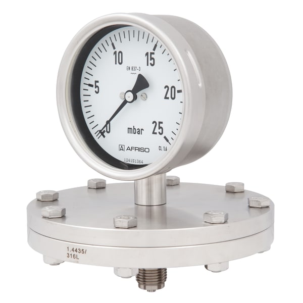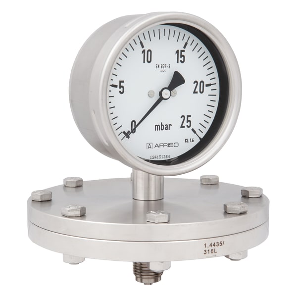 Products Our motto "Technology for Environmental Protection" has long been an inherent part of our product development philosophy and product range. We strive to improve the environment, to make processes which work with greater environmental compatibility and to avoid putting a strain on the environment. We offer you a multitude of innovative solutions, new products and smart concepts. More Informations Industries & Topics Industries & Topics Overview Fuel oil components Fuel oil components Overview Fast and clean oil filter change Avoiding fungal attacks in biofuel More performance with the sintered plastic sieve AFRISO Smart Home AFRISO Smart Home Overview Gateway HG 02 Products Products Overview AFRISOhome App Alexa Smart home applications Smart home applications Overview Leakage security Security Stand-alone applications Stand-alone applications Overview Getting started with AFRIShome Smart Home Craft 4.0 Craft 4.0 Overview OEM-Manifold systems Hydraulic Balancing Hydraulic Balancing Overview VarioQ Vario-DP Tank conversion Hygienic processes AFRISO Smart Home AFRISO Smart Home offers innovative solutions for intelligent home automation. With modern sensors and actuators, you can easily and conveniently control your home. More Informations Service-Center Service-Center Overview Service Contact persons Data exchange formats Catalogs Service-Center Flexible, cost-aware, on schedule, solution-oriented and fast – the AFRISO team always provides the decisive added value. More Informations Training & Events Training & Events Overview Exhibitions Exhibitions Overview SHK+E 2026, Essen IFH Intherm 2026, Nuremberg GET Nord 2026, Hamburg Search Industrial technology Mechanical pressure measuring instruments PF100Ch D402 Images 5 PF100Ch D402 Plattenfeder-Chemiemanometer Typ D4 Variants Documents Info housing ⌀ (nominal size)100 mmaccuracy class1,6standardEN 837-3 Benefits for low pressure rangeshigh overload protectionhigh resistanceoptional flange connections Application For corrosive gaseous and liquid media, also for use in corrosive environments. With open connection flange also suitable for viscous and polluted media. For measuring gas or vapour, observe the table "Selection Criteria as per EN 837-2" (see appendix)! Variants Technical data Technical drawings Downloads Variants RangeMounting typeTypePart number0/10 mbardirectPF100Ch D402859014020/16 mbardirectPF100Ch D402859024020/25 mbardirectPF100Ch D402859034020/40 mbardirectPF100Ch D402859044020/60 mbardirectPF100Ch D402859054020/100 mbardirectPF100Ch D402859064020/160 mbardirectPF100Ch D402859074020/250 mbardirectPF100Ch D40285908402 in-stock items manufactured goods Technical data TypeD4Nominal size100 - 100accuracy class (EN 837-3/6)1,6ranges (EN 837-3/5)see ordering tableapplication areastatic load: Full scale valuedynamic load: 0.9 x full scale valueOverpressure safety≤ 6 bar: at least 5 x FSOperating temperature rangeMedium: max. 100 °CAmbient: -20/+60 °CTemperature performanceIndication error when the temperature of the measuring system deviates from the normal temperature of 20 °C:bei Temperaturzunahme ca. ± 0,8 %/10 K,falling temperature approx. ± 0.8 %/10 Kvom jeweiligen SkalenendwertDegree of protectionIP 54 (EN 60529) Standard design Connectionstainless steel 316 Ti/316 L, bottomG½B, SW22 (EN 837-3/7.3)lower measuring flangeStainless steel 316 Lupper measuring flangeStainless steel 304Measuring elementdiaphragmMeasuring flange: DurathermSealFPM (Viton)movementStainless steelDialAluminium, weißScaling blackPointerAluminium, schwarzHousingEdelstahl 304, with blow-outbayonet bezelEdelstahl 304windowSicherheitsverbundglas Technical drawings Click the corresponding image for detail views, additional information and dimension tables. bottom connection, measuring flange ⌀ 100 Dimensions (mm)NGab∅cc1c2DGhSW10020556320100G½B12722 Downloads Plattenfederstandard- und chemiemanometer Industrial technology PDF English German AFRISO_EU-KONFORMITAETSERKLAERUNG_DRUCKGERAETE_DE.PDF Industrial technology PDF Download Montage Manometer Manuals Industrial technology PDF Download Rohrfeder-, Kapselfeder-, Plattenfeder-, Membranfedermanometer für Differenzdruck Manuals Industrial technology PDF Ukrainian German German Related products