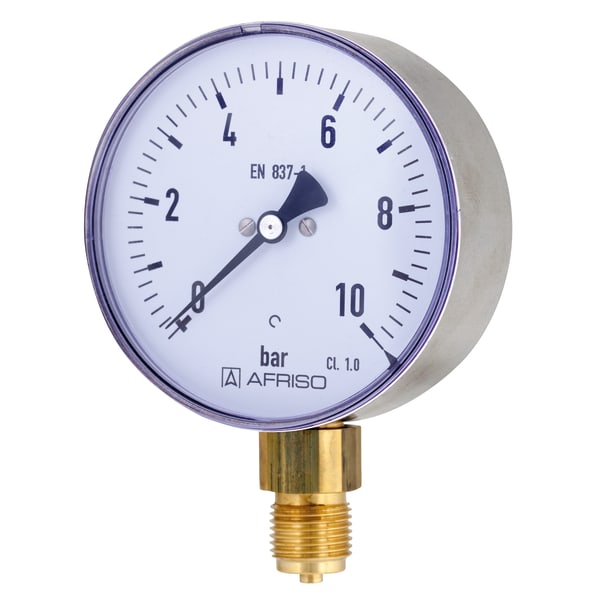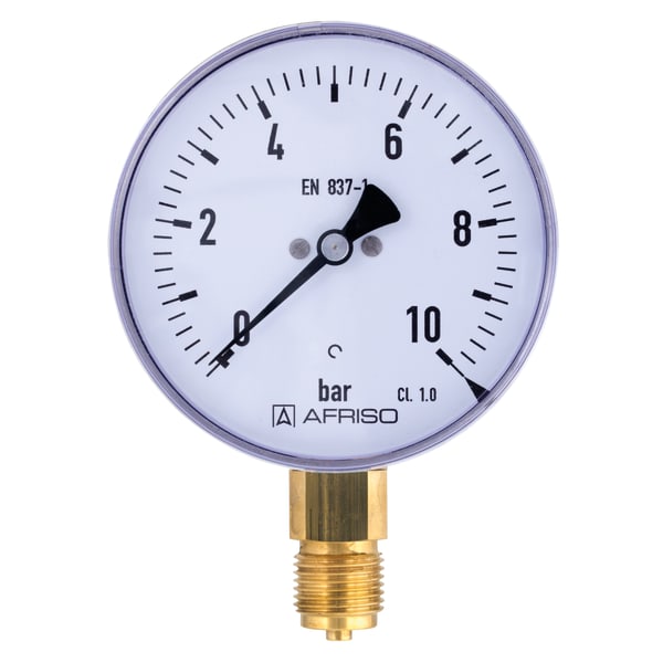 Products Our motto "Technology for Environmental Protection" has long been an inherent part of our product development philosophy and product range. We strive to improve the environment, to make processes which work with greater environmental compatibility and to avoid putting a strain on the environment. We offer you a multitude of innovative solutions, new products and smart concepts. More Informations Industries & Topics Industries & Topics Overview Fuel oil components Fuel oil components Overview Fast and clean oil filter change Avoiding fungal attacks in biofuel More performance with the sintered plastic sieve AFRISO Smart Home AFRISO Smart Home Overview Gateway HG 02 Products Products Overview AFRISOhome App Alexa Smart home applications Smart home applications Overview Leakage security Security Stand-alone applications Stand-alone applications Overview Getting started with AFRIShome Smart Home Craft 4.0 Craft 4.0 Overview OEM-Manifold systems Hydraulic Balancing Hydraulic Balancing Overview Vario-DP Tank conversion Hygienic processes AFRISO Smart Home AFRISO Smart Home offers innovative solutions for intelligent home automation. With modern sensors and actuators, you can easily and conveniently control your home. More Informations Service-Center Service-Center Overview Service Contact persons Catalogs Service-Center Flexible, cost-aware, on schedule, solution-oriented and fast – the AFRISO team always provides the decisive added value. More Informations Training & Events Training & Events Overview Exhibitions Exhibitions Overview SHK+E 2026, Essen IFH Intherm 2026, Nuremberg GET Nord 2026, Hamburg Search ... RF100I D301 85315301 RF100I 0/10bar 1/2 rad Kl.1,0 D301 Images 7 Back Bourdon tube pressure gauges for industrial applications RF100I | 85315301 Bourdon tube pressure gauges for industrial applications Type D3 manufactured goods Documents Info Range0/10 barhousing ⌀ (nominal size)100 mmConnectionG½Balignmentbottomaccuracy class1,0standardEN 837-1Part no.85315301 Benefits for machine and plant engineeringrobust stainless steel housingmany customised versions available Application For gaseous and liquid media which are not highly viscous, do not crystallise and do not attack copper alloys.! For high measuring accuracy. For measuring gas or vapour, observe the table "Selection Criteria as per EN 837-2" (see appendix)! Technical data Technical drawings Downloads Technical data TypeD3Nominal size100 - 100accuracy class (EN 837-1/6)1,0ranges (EN 837-1/5)see ordering tableapplication areastatic load≤ 600 bar: Full scale value> 600 bar: ¾ x full scale valuedynamic load≤ 600 bar: 0.9 x full scale value> 600 bar: ⅔ x full scale valueshort-term≤ 600 bar: 1.3 x full scale value> 600 bar: Full scale valueOperating temperature rangeMedium: max. 60 °CAmbient: -20/+60 °CTemperature performanceIndication error when the temperature of the measuring system deviates from the normal temperature of 20 °C:bei Temperaturzunahme ca. ± 0,4 %/10 K,falling temperature approx. ± 0.4 %/10 Kvom jeweiligen SkalenendwertDegree of protectionIP 32 (EN 60529) Standard design ConnectionBrass, bottomMeasuring elementBourdon tube≤ 60 bar: "C" type tube, Copper alloy> 60 bar: helical tube, stainless steel 316 Ti/316 LmovementBrassDialAluminium, weißScaling blackPointerAluminium, schwarzHousingEdelstahl 304windowKunststoff, eingeclipst Technical drawings Click the corresponding image for detail views, additional information and dimension tables. Bottom connection Dimensions (mm)NGab∅cc1c2GhsSW10015,6446320G½B863,522 Downloads Rohrfeder-Manometer Catalogue options Domestic Technology PDF English German AFRISO_EU-KONFORMITAETSERKLAERUNG_DRUCKGERAETE_DE.PDF Industrial technology PDF Download Montage Manometer Manuals Industrial technology PDF Download Rohrfeder-, Kapselfeder-, Plattenfeder-, Membranfedermanometer für Differenzdruck Manuals Industrial technology PDF Ukrainian German German Related products