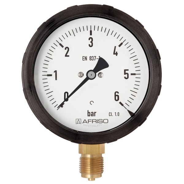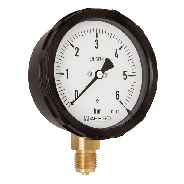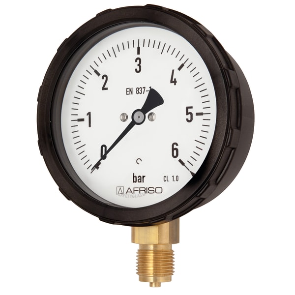 Images 5 RF100ISR D101 Rohrfeder-Manometer mit Schraubringgehäuse Typ D1 Variants Documents Info housing ⌀ (nominal size)100 mmConnectionG½Balignmentbottomaccuracy class1,0standardEN 837-1 Benefits for machine and plant engineeringextremely robust plastic housing (PA 6.6 GB30)laminated safety glass windowhigher accuracy class optional Application For gaseous and liquid media which are not highly viscous, do not crystallise and do not attack copper alloys. For high measuring accuracy.! For measuring gas or vapour, observe the table "Selection Criteria as per EN 837-2" Variants Technical data Technical drawings Downloads Variants RangeMounting typeTypePart number-1/0 bardirectRF100ISR D10185301101-1/0.6 bardirectRF100ISR D10185302101-1/+1.5 bardirectRF100ISR D10185303101-1/+3 bardirectRF100ISR D10185304101-1/+5 bardirectRF100ISR D10185305101-1/+9 bardirectRF100ISR D10185306101-1/+15 bardirectRF100ISR D101853071010/0.6 bardirectRF100ISR D101853091010/1 bardirectRF100ISR D101853101010/1.6 bardirectRF100ISR D101853111010/2.5 bardirectRF100ISR D101853121010/4 bardirectRF100ISR D101853131010/6 bardirectRF100ISR D101853141010/10 bardirectRF100ISR D101853151010/16 bardirectRF100ISR D101853161010/25 bardirectRF100ISR D101853171010/40 bardirectRF100ISR D101853181010/60 bardirectRF100ISR D101853191010/100 bardirectRF100ISR D101853201010/160 bardirectRF100ISR D101853211010/250 bardirectRF100ISR D101853221010/400 bardirectRF100ISR D101853231010/600 bardirectRF100ISR D101853241010/1 000 bardirectRF100ISR D10185325101 in-stock items manufactured goods Technical data TypeD1Nominal size100 - 100accuracy class (EN 837-1/6)1,0ranges (EN 837-1/5)see ordering tableapplication areastatic load≤ 600 bar: Full scale value> 600 bar: ¾ x full scale valuedynamic load≤ 600 bar: 0.9 x full scale value> 600 bar: ⅔ x full scale valueshort-term≤ 600 bar: 1.3 x full scale value> 600 bar: Full scale valueOperating temperature rangeMedium: max. 60 °CAmbient: -20/+60 °CTemperature performanceIndication error when the temperature of the measuring system deviates from the normal temperature of 20 °C:bei Temperaturzunahme ca. ± 0,4 %/10 K,falling temperature approx. ± 0.4 %/10 Kvom jeweiligen SkalenendwertDegree of protectionIP 54 (EN 60529) with housing vent (≤ 25 bar) Standard design ConnectionBrass, bottomMeasuring elementBourdon tube≤ 60 bar: "C" type tube, Copper alloy> 60 bar: helical tube, stainless steel 316 Ti/316 LmovementBrassDialAluminium, weißScaling blackPointerAluminium, schwarzHousingKunststoff (PA 6.6 GB30), with blow-outScrew type bezelKunststoff (PA 6.6 GB30)windowSicherheitsverbundglas Technical drawings Click the corresponding image for detail views, additional information and dimension tables. Bottom connection Dimensions (mm) NG a b∅c c1 c2 d4D G h 100 15,5 50 6 3 20 101 114 G½B 86 Downloads AFRISO_EU-KONFORMITAETSERKLAERUNG_DRUCKGERAETE_DE.PDF Industrial technology PDF Download Montage Manometer Manuals Industrial technology PDF Download Rohrfeder-, Kapselfeder-, Plattenfeder-, Membranfedermanometer für Differenzdruck Manuals Industrial technology PDF Ukrainian German German