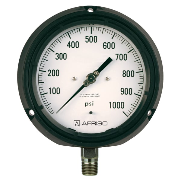 Images 2 RF130PGGly D602 Rohrfeder-Standardmanometer Typ D6 Variants Documents Info housing ⌀ (nominal size)4.5 "Connection½-14 NPTalignmentbottomaccuracy classGrade 2AstandardASME B 40.1 Benefits extremely robust pressure gauge for offshore and onshore applicationsglass-fibre reinforced safety housing with solid baffle wall and blow-outintegrated pressure compensation diaphragmtightness-tested with heliumGOSSTANDART-certified Application For corrosive gaseous and liquid media which are not highly viscous and do not crystallise. Specially suitable for the oil and chemical industries. Variants Technical data Technical drawings Downloads Variants RangeMounting typeTypePart number-1/0 barback flangeRF130PGGly D60287901602-1/0.6 barback flangeRF130PGGly D60287902602-1/+1.5 barback flangeRF130PGGly D60287903602-1/+3 barback flangeRF130PGGly D60287904602-1/+5 barback flangeRF130PGGly D60287905602-1/+9 barback flangeRF130PGGly D60287906602-1/+15 barback flangeRF130PGGly D602879076020/0.6 barback flangeRF130PGGly D602879096020/1 barback flangeRF130PGGly D602879106020/1.6 barback flangeRF130PGGly D602879116020/2.5 barback flangeRF130PGGly D602879126020/4 barback flangeRF130PGGly D602879136020/6 barback flangeRF130PGGly D602879146020/10 barback flangeRF130PGGly D602879156020/16 barback flangeRF130PGGly D602879166020/25 barback flangeRF130PGGly D602879176020/40 barback flangeRF130PGGly D602879186020/60 barback flangeRF130PGGly D602879196020/100 barback flangeRF130PGGly D602879206020/160 barback flangeRF130PGGly D602879216020/250 barback flangeRF130PGGly D602879226020/400 barback flangeRF130PGGly D602879236020/600 barback flangeRF130PGGly D60287924602 in-stock items manufactured goods Technical data TypeD6Nominal size4.5 - 4.5accuracy class (ASME B 40.100)Grade 2A (correspond to an accuracy of 0.5 %)ranges (EN 837-1/5)see ordering tableapplication areastatic load: Full scale valuedynamic load: 0.9 x full scale valueshort-term: 1.3 x full scale valueOperating temperature rangeMedium: max. 100 °CAmbient: -20/+65 °CTemperature performanceIndication error when the temperature of the measuring system deviates from the normal temperature of 20 °C:bei Temperaturzunahme ca. ± 0,4 %/10 K,falling temperature approx. ± 0.4 %/10 Kvom jeweiligen SkalenendwertDegree of protectionIP 67 (EN 60529) Standard design ConnectionStainless steel 316 L: D602bottomMeasuring elementBourdon tube, stainless steel 316 Ti/316 L≤ 60 bar: "C" type tube> 60 bar: helical tubetightness-tested with heliummovementStainless steelDialAluminium, weißScaling blackPointermicro-adjustable pointerMessing, schwarzHousingPP-GF20, schwarzwith solid baffle wall and blow-out,Befestigungsrand hinten integriertScrew type bezelPP-GF20, schwarz InternalwindowKunststoff (PMMA)filling liquidglycerine (99.5 %) Technical drawings Click the corresponding image for detail views, additional information and dimension tables. Bottom connection Dimensions (mm) NG a b c1 c2 d1 d2 d3∅D G h h1 s1 s2 SW4½" 40 82,5 15 20 137 148 6 129½-14 NPT 102 67 12,5 25 22 Downloads AFRISO_EU-KONFORMITAETSERKLAERUNG_DRUCKGERAETE_DE.PDF Industrial technology PDF Download Montage Manometer Manuals Industrial technology PDF Download Rohrfeder-, Kapselfeder-, Plattenfeder-, Membranfedermanometer für Differenzdruck Manuals Industrial technology PDF Ukrainian German German