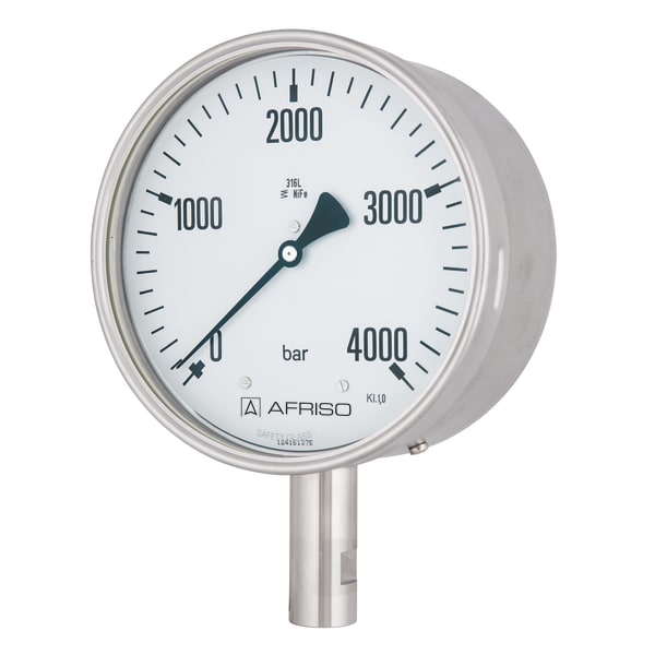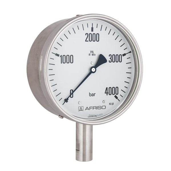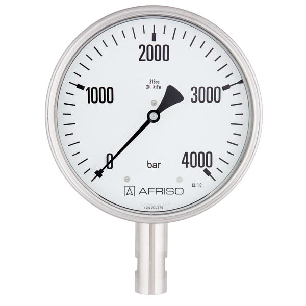 Images 5 RF160HD D402 Rohrfeder-Hochdruckmanometer Typ D4 Variants Documents Info housing ⌀ (nominal size)160 mmConnectionHP connection ¼" with female thread M16 x 1.5alignmentbottomaccuracy class1,0 Benefits for pressure ranges up to 4,000 barHousing with solid baffle wall and blow-out Application For measurement of extremely high pressures in gaseous and liquid corrosive media which are not highly viscous and do not crystallise; also suitable for corrosive atmospheres. Variants Technical data Technical drawings Downloads Variants RangeMounting typeTypePart number0/2 500 bardirectRF160HD D402852774020/4 000 bardirectRF160HD D40285278402 in-stock items manufactured goods Technical data TypeD4Nominal size160 - 160accuracy class (EN 837-1/6)1,0ranges0/2 500 barOperating temperature rangeMedium: max. 100 °CAmbient: -20/+60 °CTemperature performanceIndication error when the temperature of the measuring system deviates from the normal temperature of 20 °C:bei Temperaturzunahme ca. ± 0,4 %/10 K,falling temperature approx. ± 0.4 %/10 Kvom jeweiligen SkalenendwertDegree of protectionIP 54 (EN 60529) Standard design ConnectionStainless steel 316 L, bottomHP connection ¼" with female thread M16 x 1.5 with sealing cone 60°Measuring elementBourdon tube, NiFe alloyhelical tubemovementStainless steelDialAluminium, weißScaling blackPointerAluminium, schwarzHousingEdelstahl 304, with solid baffle wall and blow-outbayonet bezelEdelstahl 304windowSicherheitsverbundglas Technical drawings Click the corresponding image for detail views, additional information and dimension tables. Bottom connection Dimensions (mm) NG a b h SW 100 27 60 71 22 160 34 78 139 22 Downloads AFRISO_EU-KONFORMITAETSERKLAERUNG_DRUCKGERAETE_DE.PDF Industrial technology PDF Download Montage Manometer Manuals Industrial technology PDF Download Rohrfeder-, Kapselfeder-, Plattenfeder-, Membranfedermanometer für Differenzdruck Manuals Industrial technology PDF Ukrainian German German