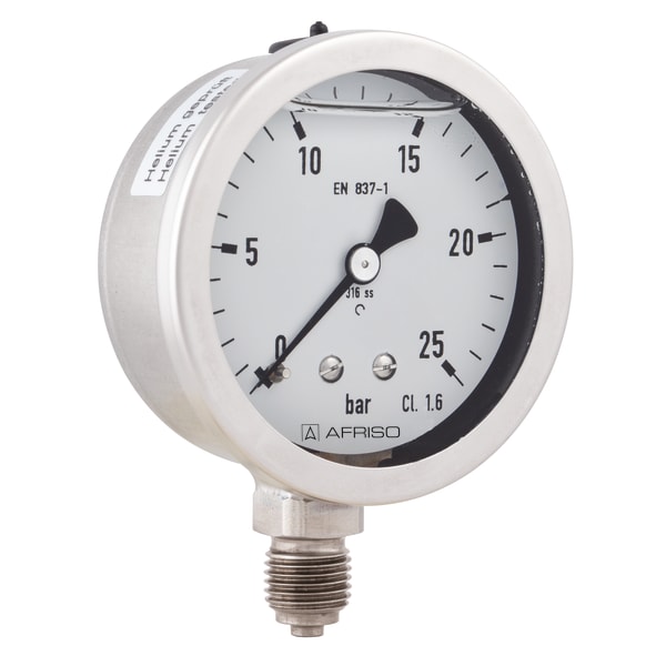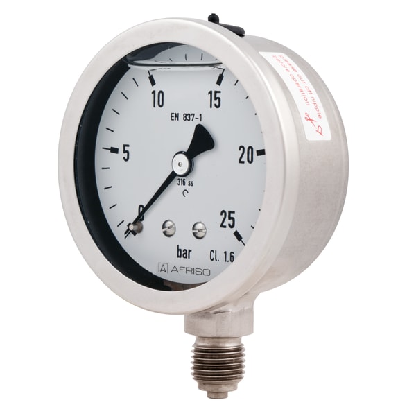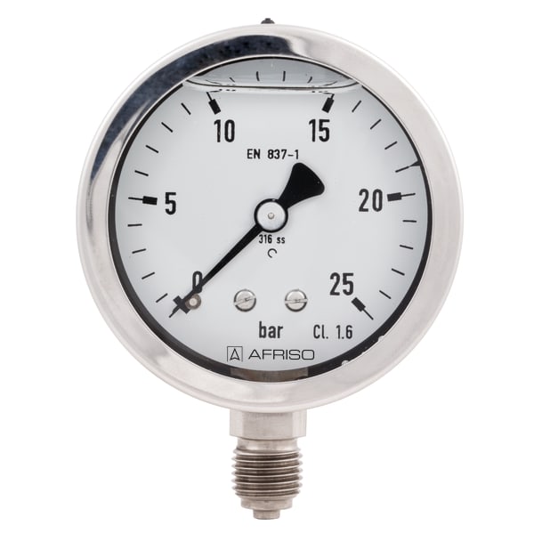Products Our motto "Technology for Environmental Protection" has long been an inherent part of our product development philosophy and product range. We strive to improve the environment, to make processes which work with greater environmental compatibility and to avoid putting a strain on the environment. We offer you a multitude of innovative solutions, new products and smart concepts. More Informations Industries & Topics Industries & Topics Overview Fuel oil components Fuel oil components Overview Fast and clean oil filter change Avoiding fungal attacks in biofuel More performance with the sintered plastic sieve AFRISO Smart Home AFRISO Smart Home Overview Gateway HG 02 Products Products Overview AFRISOhome App Alexa Smart home applications Smart home applications Overview Leakage security Security Stand-alone applications Stand-alone applications Overview Getting started with AFRIShome Smart Home Craft 4.0 Craft 4.0 Overview OEM-Manifold systems Hydraulic Balancing Hydraulic Balancing Overview VarioQ Vario-DP Tank conversion Hygienic processes AFRISO Smart Home AFRISO Smart Home offers innovative solutions for intelligent home automation. With modern sensors and actuators, you can easily and conveniently control your home. More Informations Service-Center Service-Center Overview Service Contact persons Data exchange formats Catalogs Service-Center Flexible, cost-aware, on schedule, solution-oriented and fast – the AFRISO team always provides the decisive added value. More Informations Training & Events Training & Events Overview Exhibitions Exhibitions Overview SHK+E 2026, Essen IFH Intherm 2026, Nuremberg GET Nord 2026, Hamburg Schulungen & Trainings Schulungen & Trainings Overview Heizen mit flüssigen Brennstoffen Inhouse-Schulung - Heizen mit flüssigen Brennstoffen Inhouse-Schulung Heizölverbraucheranlagen Smart Home Experte Search Industrial technology Mechanical pressure measuring instruments RF63ChGly D702 Images 4 RF63ChGly D702 Rohrfeder-Chemiemanometer Typ D7 mit Glyzerinfüllung Variants Documents Info housing ⌀ (nominal size)63 mmConnectionG¼Balignmentbottomaccuracy class1,6standardEN 837-1 Benefits for chemical and process engineering applicationsmeasuring system fully welded to housingextremely robust designcan be used in case of heavy vibrations and high, dynamic pressure loadstightness-tested with heliumDNV- and GOSSTANDART-certifiedEx version (optional) Application For corrosive gaseous and liquid media which are not highly viscous and do not crystallise; suitable for corrosive environments. For measurements in areas with high vibration levels and high, dynamic pressure loads.! For measuring gas or vapour, observe the table "Selection Criteria as per EN 837-2" (see appendix)! Variants Technical data Technical drawings Downloads Variants RangeMounting typeTypePart number-1/0 bardirectRF63ChGly D70285101702-1/0.6 bardirectRF63ChGly D70285102702-1/+1.5 bardirectRF63ChGly D70285103702-1/+3 bardirectRF63ChGly D70285104702-1/+5 bardirectRF63ChGly D70285105702-1/+9 bardirectRF63ChGly D70285106702-1/+15 bardirectRF63ChGly D702851077020/0.6 bardirectRF63ChGly D702851097020/1 bardirectRF63ChGly D702851107020/1.6 bardirectRF63ChGly D702851117020/2.5 bardirectRF63ChGly D702851127020/4 bardirectRF63ChGly D702851137020/6 bardirectRF63ChGly D702851147020/10 bardirectRF63ChGly D702851157020/16 bardirectRF63ChGly D702851167020/25 bardirectRF63ChGly D702851177020/40 bardirectRF63ChGly D702851187020/60 bardirectRF63ChGly D702851197020/100 bardirectRF63ChGly D702851207020/160 bardirectRF63ChGly D702851217020/250 bardirectRF63ChGly D702851227020/400 bardirectRF63ChGly D702851237020/600 bardirectRF63ChGly D702851247020/1 000 bardirectRF63ChGly D70285125702 in-stock items manufactured goods Technical data TypeD7Nominal size63 - 63accuracy class (EN 837-1/6)1,6ranges (EN 837-1/5)see ordering tableapplication areastatic load: ¾ x full scale valuedynamic load: ⅔ x full scale valueshort-term: Full scale valueOperating temperature rangeMedium: max. 100 °CAmbient: -20/+60 °CTemperature performanceIndication error when the temperature of the measuring system deviates from the normal temperature of 20 °C:bei Temperaturzunahme ca. ± 0,4 %/10 K,falling temperature approx. ± 0.4 %/10 Kvom jeweiligen SkalenendwertDegree of protectionIP 54 (EN 60529) with housing vent (< 25 bar) Standard design ConnectionStainless steel 316 L, bottomMeasuring elementBourdon tube, stainless steel 316 Ti/316 L≤ 60 bar: "C" type tube> 60 bar: helical tubetightness-tested with heliummovementStainless steelDialAluminium, weißScaling blackPointerAluminium, schwarzHousingEdelstahl 304, with blow-outbayonet bezelNG 63: Edelstahl 304windowNG 63: Sicherheitsverbundglasfilling liquidglycerine (99.5 %) Technical drawings Click the corresponding image for detail views, additional information and dimension tables. NG 50/63 – bottom connection Dimensions (mm) NG a b∅c c1 c2 D G h s SW 50 10,5 28 5 2 13 53 G¼B 46 4,5 14 63 11,5 32 5 2 13 68 G¼B 53 7 14 Downloads ATEX Bescheinigung Manometer Certificates / DIBt approvals Industrial technology PDF English German AFRISO_EU-KONFORMITAETSERKLAERUNG_DRUCKGERAETE_DE.PDF Industrial technology PDF Download Montage Manometer Manuals Industrial technology PDF Download Rohrfeder-, Kapselfeder-, Plattenfeder-, Membranfedermanometer für Differenzdruck Manuals Industrial technology PDF Ukrainian German German RF63CHGLY_D702_851XX702.STP STEP 3D Modell Industrial technology STP Download Related products