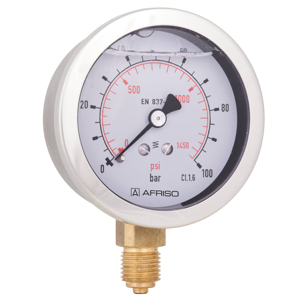 Products Our motto "Technology for Environmental Protection" has long been an inherent part of our product development philosophy and product range. We strive to improve the environment, to make processes which work with greater environmental compatibility and to avoid putting a strain on the environment. We offer you a multitude of innovative solutions, new products and smart concepts. More Informations Industries & Topics Industries & Topics Overview Fuel oil components Fuel oil components Overview Fast and clean oil filter change Avoiding fungal attacks in biofuel More performance with the sintered plastic sieve AFRISO Smart Home AFRISO Smart Home Overview Gateway HG 02 Products Products Overview AFRISOhome App Alexa Smart home applications Smart home applications Overview Leakage security Security Stand-alone applications Stand-alone applications Overview Getting started with AFRIShome Smart Home Craft 4.0 Craft 4.0 Overview OEM-Manifold systems Hydraulic Balancing Hydraulic Balancing Overview VarioQ Vario-DP Tank conversion Hygienic processes AFRISO Smart Home AFRISO Smart Home offers innovative solutions for intelligent home automation. With modern sensors and actuators, you can easily and conveniently control your home. More Informations Service-Center Service-Center Overview Service Contact persons Data exchange formats Catalogs Service-Center Flexible, cost-aware, on schedule, solution-oriented and fast – the AFRISO team always provides the decisive added value. More Informations Training & Events Training & Events Overview Exhibitions Exhibitions Overview SHK+E 2026, Essen IFH Intherm 2026, Nuremberg GET Nord 2026, Hamburg Schulungen & Trainings Schulungen & Trainings Overview Heizen mit flüssigen Brennstoffen Inhouse-Schulung - Heizen mit flüssigen Brennstoffen Inhouse-Schulung Heizölverbraucheranlagen Smart Home Experte Search Industrial technology Mechanical pressure measuring instruments RF63Gly D701 Images 5 RF63Gly D701 Rohrfeder-Glyzerinmanometer Typ D7 Variants Documents Info housing ⌀ (nominal size)63 mmConnectionG¼Balignmentbottomaccuracy class1,6standardEN 837-1 Benefits robust stainless steel housingcan be used in case of heavy vibrations and high, dynamic pressure loadslonger service life due to less wear and corrosion protection of the measuring systemNo steaming up of the inside of the window in case of outdoor applications Application For gaseous and liquid media which are not highly viscous, do not crystallise and do not attack copper alloys. For measurements in areas with high vibration levels and high, dynamic pressure loads. Variants Technical data Technical drawings Downloads Variants RangeMounting typeTypePart number-1/0 bardirectRF63Gly D70185101701-1/0.6 bardirectRF63Gly D70185102701-1/+1.5 bardirectRF63Gly D70185103701-1/+3 bardirectRF63Gly D70185104701-1/+5 bardirectRF63Gly D70185105701-1/+9 bardirectRF63Gly D70185106701-1/+15 bardirectRF63Gly D701851077010/0.6 bardirectRF63Gly D701851097010/1 bardirectRF63Gly D701851107010/1.6 bardirectRF63Gly D701851117010/2.5 bardirectRF63Gly D701851127010/4 bardirectRF63Gly D701851137010/6 bardirectRF63Gly D701851147010/10 bardirectRF63Gly D701851157010/16 bardirectRF63Gly D701851167010/25 bardirectRF63Gly D701851177010/40 bardirectRF63Gly D701851187010/60 bardirectRF63Gly D701851197010/100 bardirectRF63Gly D701851207010/160 bardirectRF63Gly D701851217010/250 bardirectRF63Gly D701851227010/315 bardirectRF63Gly D701868187010/400 bardirectRF63Gly D701851237010/600 bardirectRF63Gly D70185124701 in-stock items manufactured goods Technical data TypeD7Nominal size63 - 63accuracy class (EN 837-1/6)1,6ranges (EN 837-1/5)see ordering tableapplication areastatic load: ¾ x full scale valuedynamic load: ⅔ x full scale valueshort-term: Full scale valueOperating temperature rangeMedium: max. 60 °CAmbient: -20/+60 °CDegree of protectionIP 54 (EN 60529) with housing vent (≤ 25 bar) Standard design ConnectionBrass, bottomMeasuring elementBourdon tube≤ 60 bar: "C" type tube> 60 bar: helical tubemovementBrassDialAluminium, weißRF63Gly: dual scale, bar outer, black – psi inner, redPointerAluminium, schwarzHousingEdelstahl 304, with blow-outcrimped bezelEdelstahl 304windowKunststofffilling liquidglycerine (99.5 %) Technical drawings Click the corresponding image for detail views, additional information and dimension tables. NG 50/63 – bottom connection Dimensions (mm) NG a b∅c c1 c2 D G h s SW 50 11 28 5 2 13 53 G¼B 45,5 4,5 14 63 9,5 30,5 5 2 13 68 G¼B 53 7 14 Downloads ATEX Bescheinigung Manometer Certificates / DIBt approvals Industrial technology PDF English German Rohrfeder-Manometer Domestic Technology PDF English German AFRISO_EU-KONFORMITAETSERKLAERUNG_DRUCKGERAETE_DE.PDF Industrial technology PDF Download Montage Manometer Manuals Industrial technology PDF Download Rohrfeder-, Kapselfeder-, Plattenfeder-, Membranfedermanometer für Differenzdruck Manuals Industrial technology PDF Ukrainian German German RF63GLY_D701_851XX701.STP STEP 3D Modell Industrial technology STP Download Related products