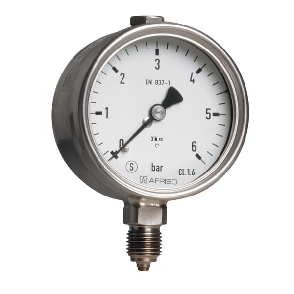 Products Our motto "Technology for Environmental Protection" has long been an inherent part of our product development philosophy and product range. We strive to improve the environment, to make processes which work with greater environmental compatibility and to avoid putting a strain on the environment. We offer you a multitude of innovative solutions, new products and smart concepts. More Informations Industries & Topics Industries & Topics Overview Fuel oil components Fuel oil components Overview Fast and clean oil filter change Avoiding fungal attacks in biofuel More performance with the sintered plastic sieve AFRISO Smart Home AFRISO Smart Home Overview Gateway HG 02 Products Products Overview AFRISOhome App Alexa Smart home applications Smart home applications Overview Leakage security Security Stand-alone applications Stand-alone applications Overview Getting started with AFRIShome Smart Home Craft 4.0 Craft 4.0 Overview OEM-Manifold systems Hydraulic Balancing Hydraulic Balancing Overview VarioQ Vario-DP Tank conversion Hygienic processes AFRISO Smart Home AFRISO Smart Home offers innovative solutions for intelligent home automation. With modern sensors and actuators, you can easily and conveniently control your home. More Informations Service-Center Service-Center Overview Service Contact persons Data exchange formats Catalogs Service-Center Flexible, cost-aware, on schedule, solution-oriented and fast – the AFRISO team always provides the decisive added value. More Informations Training & Events Training & Events Overview Exhibitions Exhibitions Overview SHK+E 2026, Essen IFH Intherm 2026, Nuremberg GET Nord 2026, Hamburg Search Industrial technology Mechanical pressure measuring instruments RF63Si D402 Images 3 RF63Si D402 Rohrfeder-Sicherheitsmanometer Typ D4 Variants Documents Info housing ⌀ (nominal size)63 mmConnectionG¼Balignmentbottomaccuracy class2,5standardEN 837-1 Benefits Safety housing S3 as per EN 837-1/9.7.2measuring system fully welded to housingtightness-tested with heliumDNV- and GOSSTANDART-certifiedEx version (optional) Application For corrosive gaseous and liquid media which are not highly viscous and do not crystallise; suitable for corrosive environments. This gauge is designed for applications as per EN 837-1/9.7.2. Variants Technical data Technical drawings Downloads Variants RangeMounting typeTypePart number0/600 bardirectRF63Si D402854244020/1 000 bardirectRF63Si D40285425402 in-stock items manufactured goods Technical data TypeD4Nominal size63 - 63accuracy classEN 837-1/6NG 63, ≥ 600 bar: 2,5ranges (EN 837-1/5)see ordering tableNG 100, NG 160static loaddynamic loadshort-termOperating temperature rangeMedium: max. 100 °CAmbient: -20/+60 °CDegree of protectionIP 54 (EN 60529) Standard design ConnectionStainless steel 316 L, bottomMeasuring elementBourdon tubestainless steel 316 Ti/316 L≤ 60 bar: "C" type tube> 60 bar: helical tubetightness-tested with heliummovementStainless steelDialAluminium, weißScaling blackPointerAluminium, schwarzHousingEdelstahl 304, with solid baffle wall and blow-out (S3)bayonet bezelEdelstahl 304windowSicherheitsverbundglas Technical drawings Click the corresponding image for detail views, additional information and dimension tables. NG 63 – bottom connection Dimensions (mm) NG a b∅c c1 c2 G h SW 63 18 41 5 2 13 G¼B 53 14 Downloads Rohrfeder-Manometer Domestic Technology PDF English German Auswahlkriterien und Sicherheitsaspekte für Druckmessgeräte nach EN 837-2 PDF English German AFRISO_EU-KONFORMITAETSERKLAERUNG_DRUCKGERAETE_DE.PDF Industrial technology PDF Download Montage Manometer Manuals Industrial technology PDF Download Rohrfeder-, Kapselfeder-, Plattenfeder-, Membranfedermanometer für Differenzdruck Manuals Industrial technology PDF Ukrainian German German RF63SI_D402_854XX402.STP STEP 3D Modell Industrial technology STP Download Related products